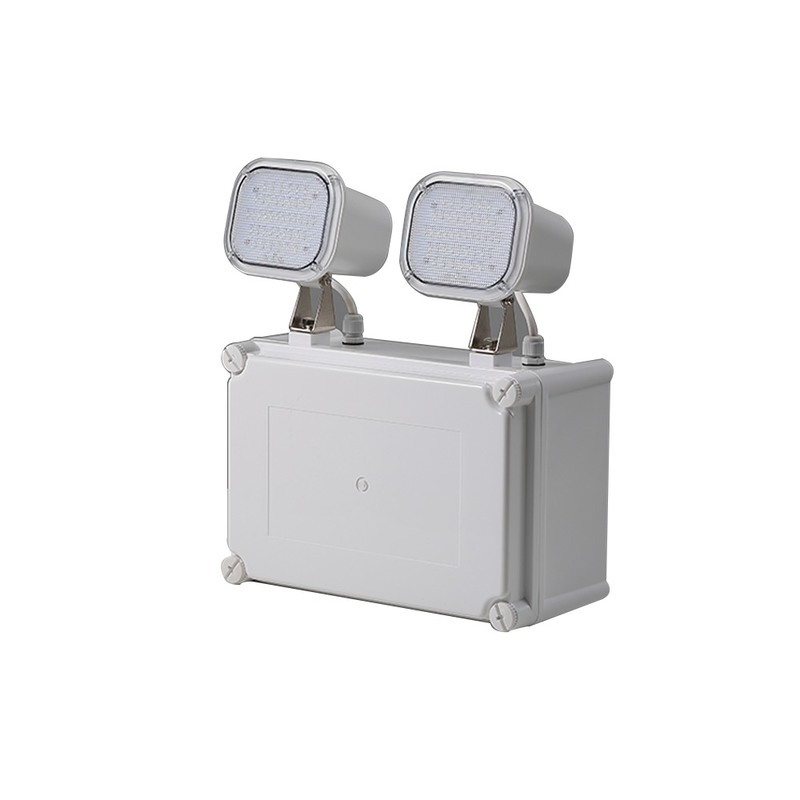 Professional wall-mounted emergency light with twin LED spotlights, designed for hotel and commercial applications. Features IP65 waterproof rating and high lumen output for reliable emergency illumination.